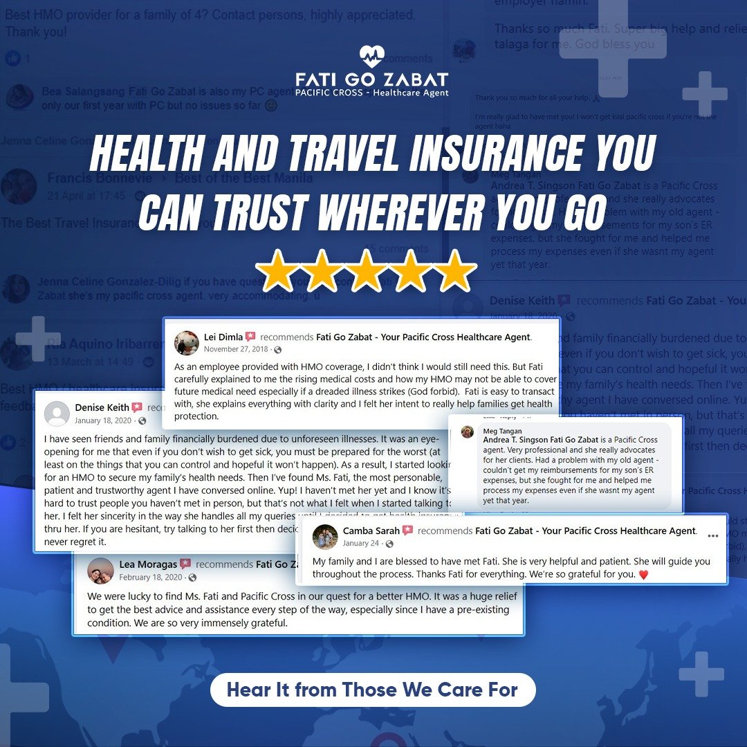 "It’s been a huge blessing to have Ms. Fati & Pacific Cross as our health insurance provider! We are on our 3rd yr now. The hassle-free claims, cash-reimbursement transactions, client-friendly services, and for Ms Fati’s patience and effort to educate and answer our endless HMO medical-related queries are all top-notch! We are now testifying to each and every group of friends we have how EFFICIENT Pacific Cross is and Ms Fati is the best! God bless and continue to help more people 💙💯🫶"